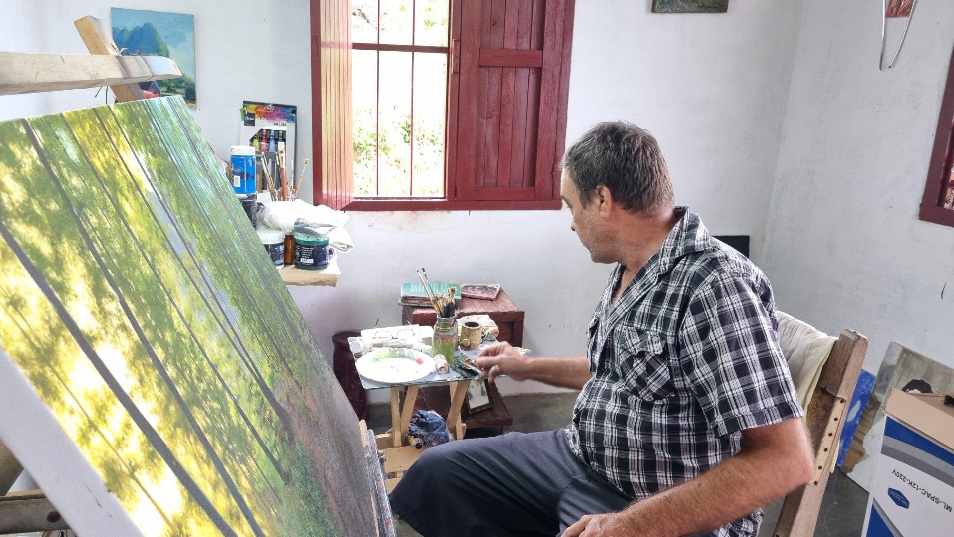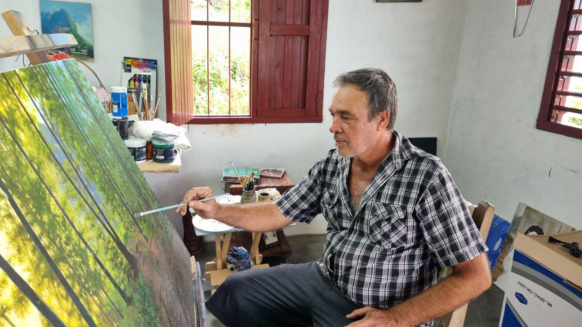 Située dans le hameau d’El Abra, le long de la route vers la vallée de Viñales, la maison de Miguel Antonio Remedios reflète l’architecture traditionnelle de la région. Né à La Palma, ce jeune homme a commencé des études de droit avant de choisir de se consacrer à sa passion : la peinture. Artiste plasticien autodidacte, il dispose d’un espace dédié dans sa maison où il expose ses œuvres, inspirées par les paysages, la végétation et la tranquillité environnante.