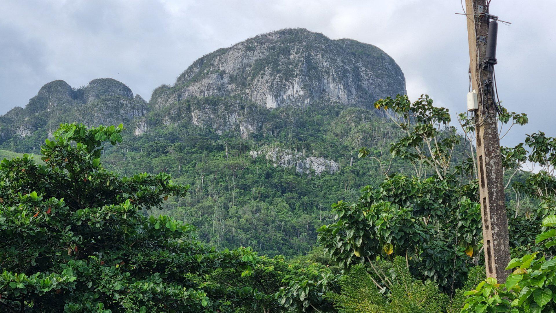 Benito propose l'essentiel du repas créole. La table est dressée sous un Ranchon au grand air, devant le paysage formé par les Mogotes.