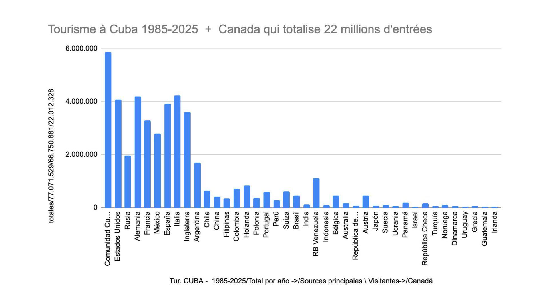 Toutes les entrées à Cuba incluant les touristes, par pays, depuis 1985.
