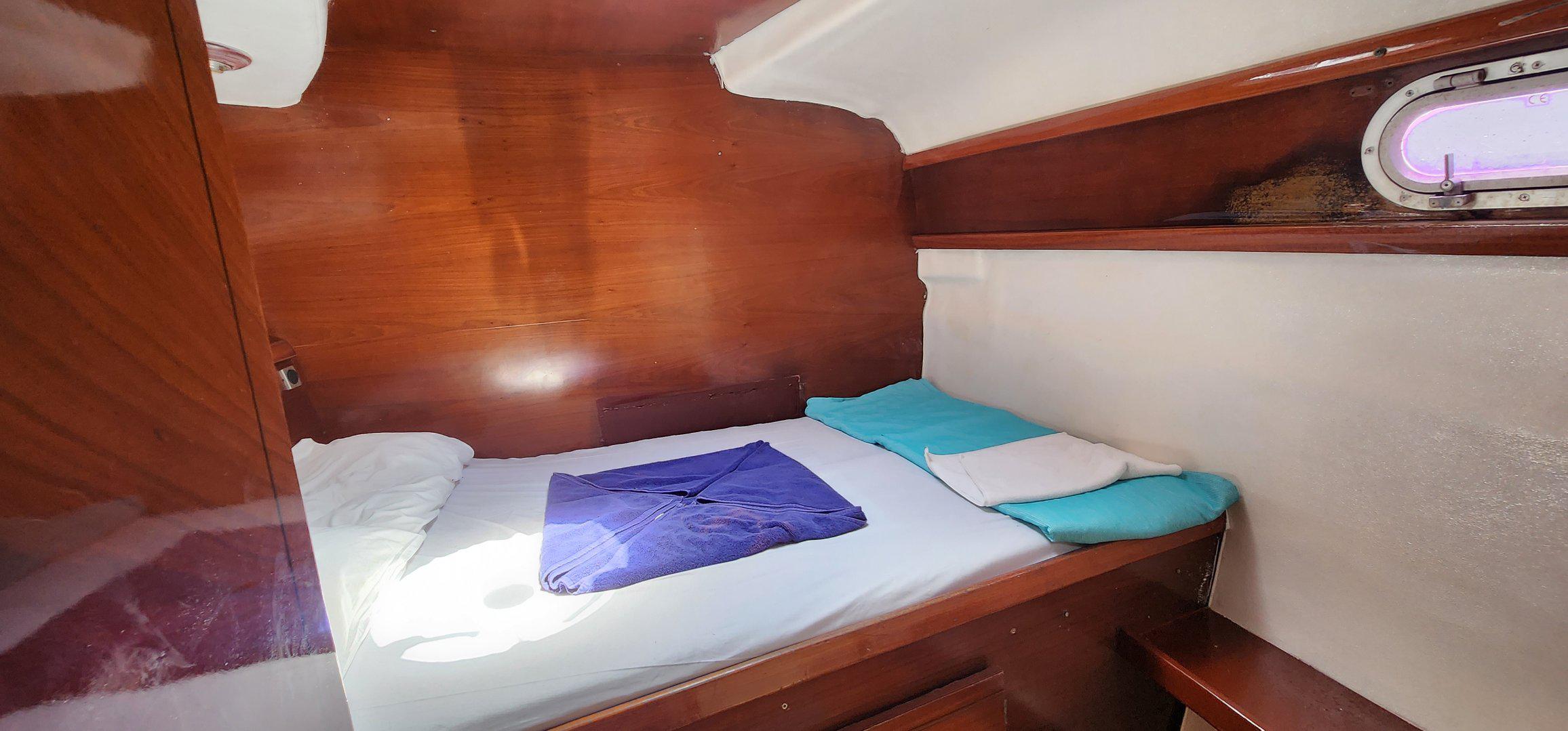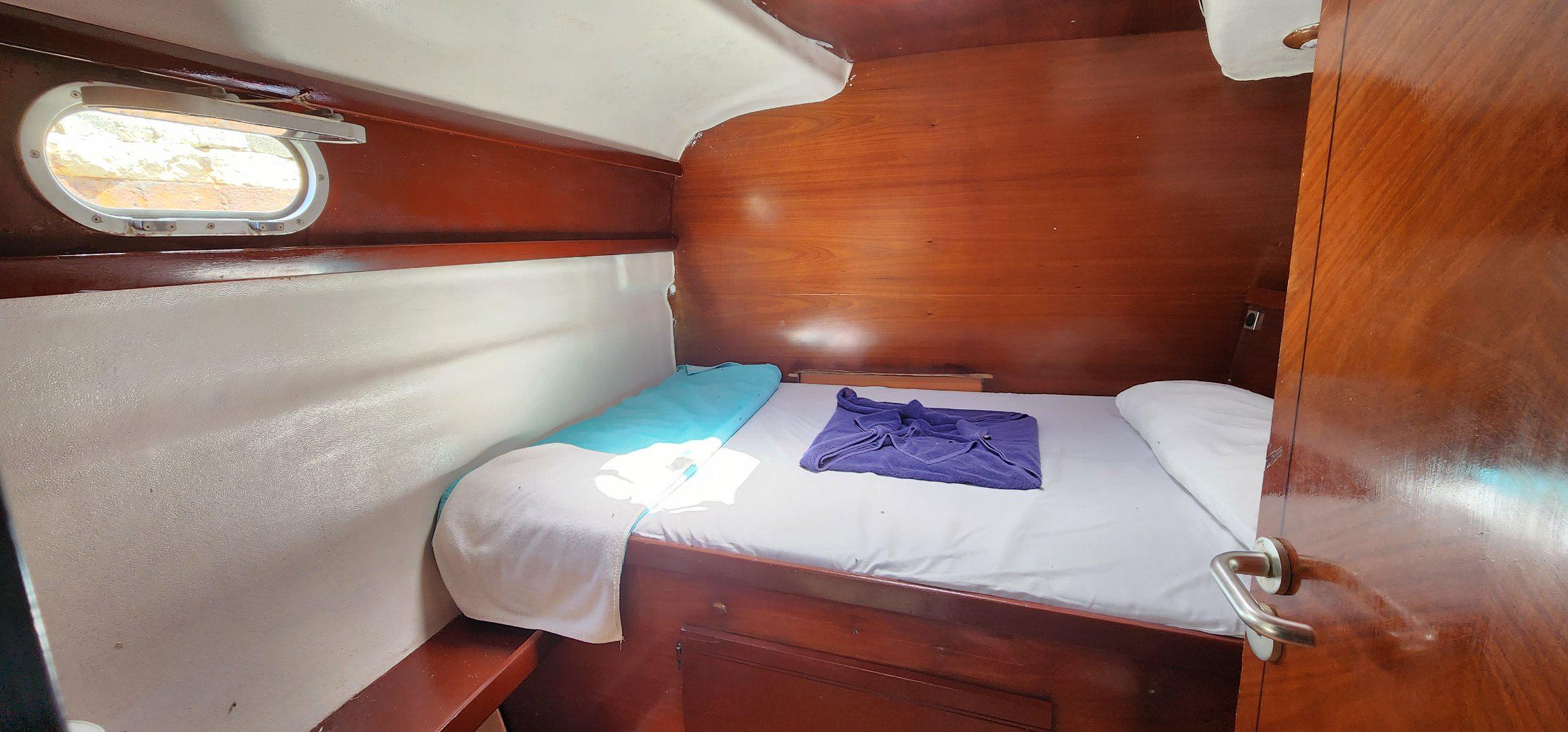 Le bateau dispose de 4 cabines, chacune équipé d'un hublot et d'un lit double. Il y a une une salle de bain pour deux cabines.