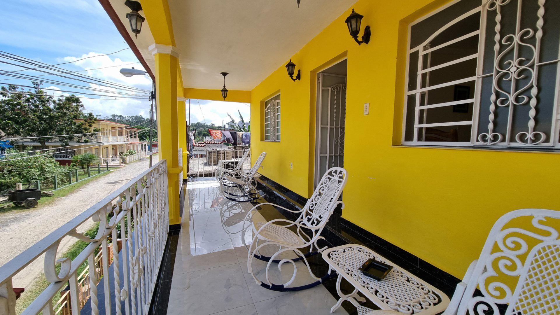 Il s’agit d’une construction moderne de deux étages, relativement rare dans la région. Les propriétaires vivent au rez-de-chaussée, tandis que les voyageurs disposent d’un étage entièrement indépendant, accessible par un escalier extérieur latéral, garantissant une autonomie appréciable tout en conservant une présence locale discrète. Le niveau supérieur comprend deux grandes terrasses aménagées, propices au repos, à la lecture ou à l’observation de la vie du quartier à différents moments de la journée. La maison est lumineuse, bien ventilée et adaptée aux conditions climatiques de Viñales. La décoration caribéenne est simple et cohérente, et le mobilier est en bon état. Un espace distinct est réservé au service du petit-déjeuner, permettant d’organiser les matinées de façon fluide.