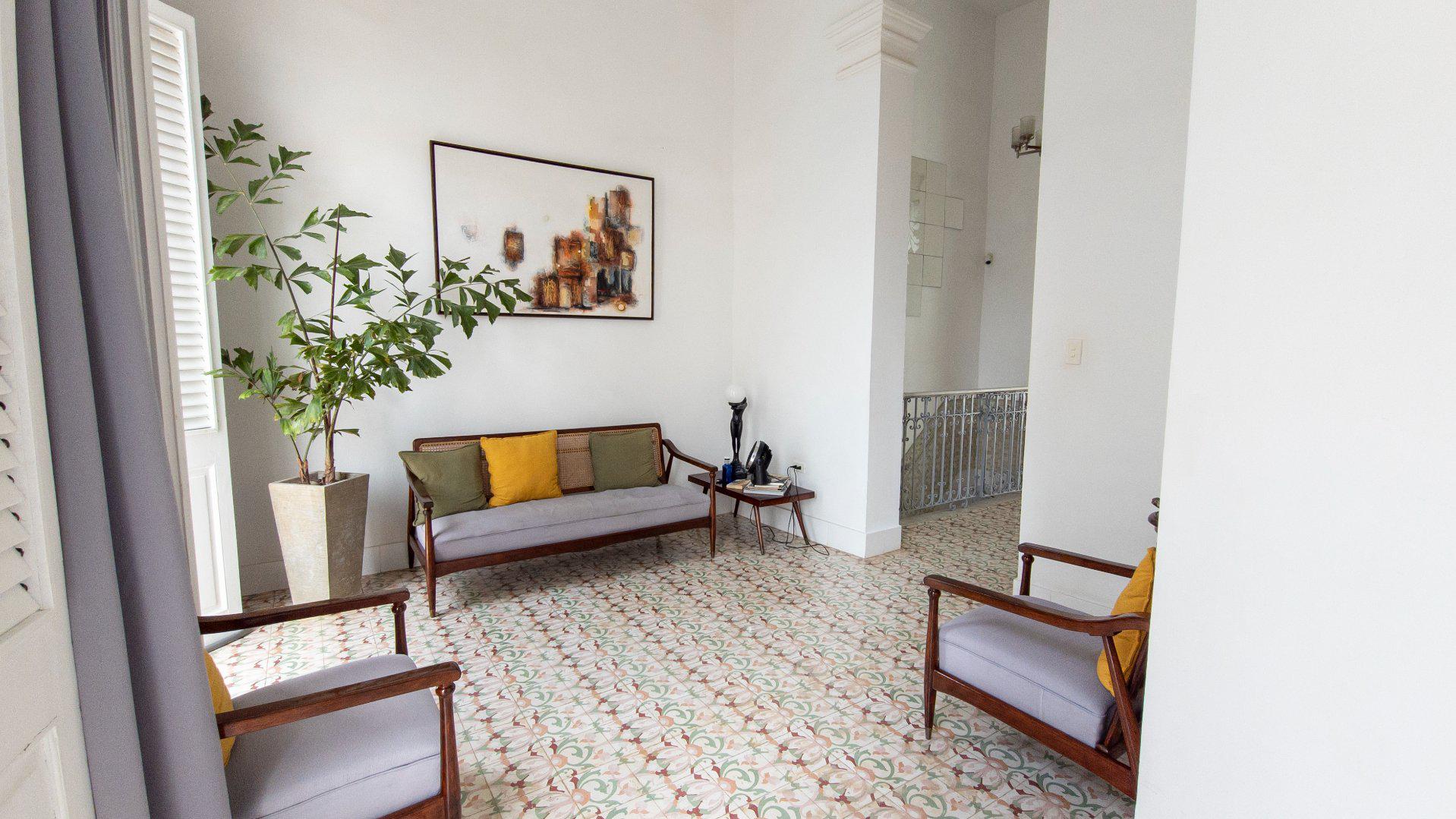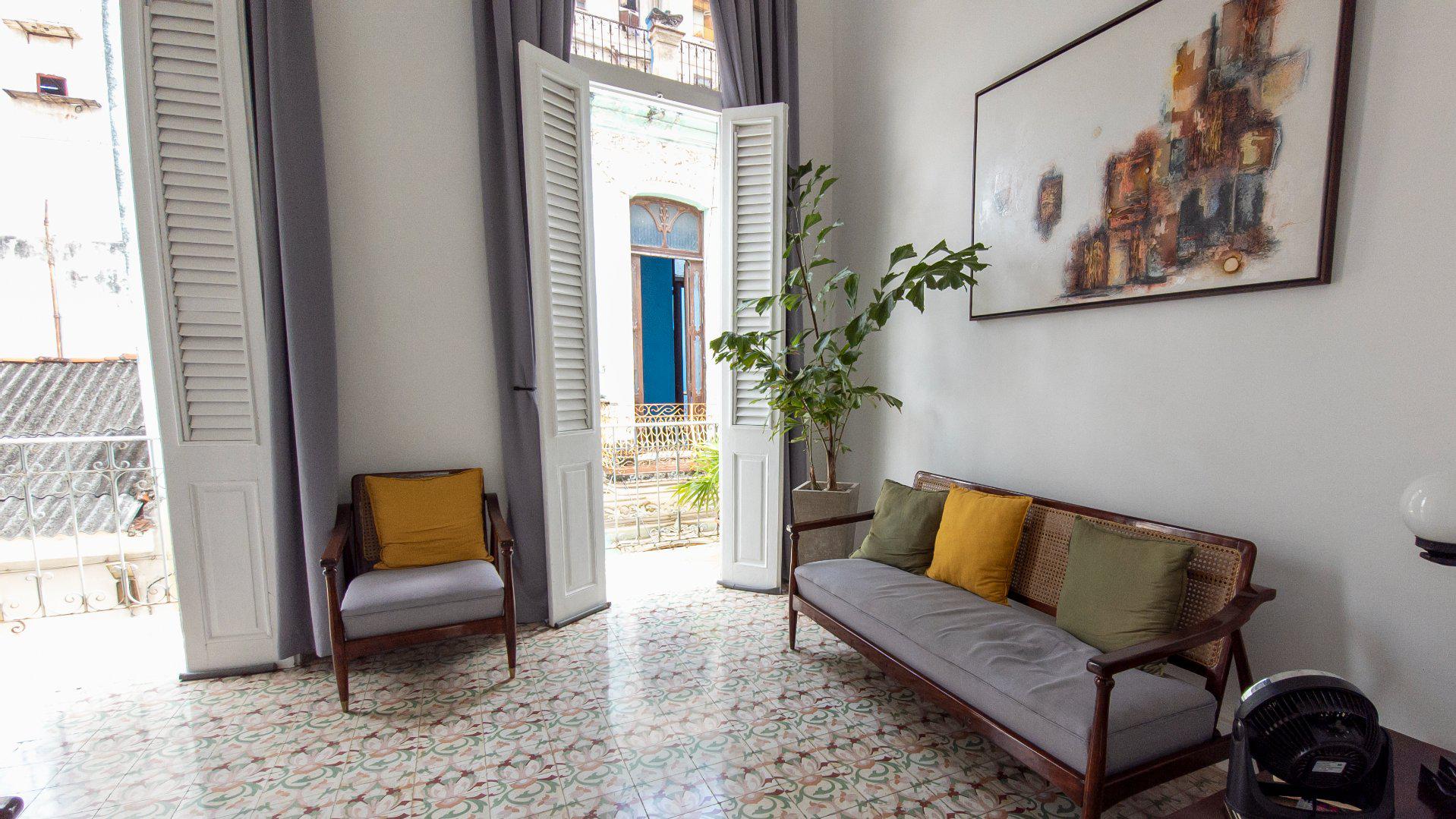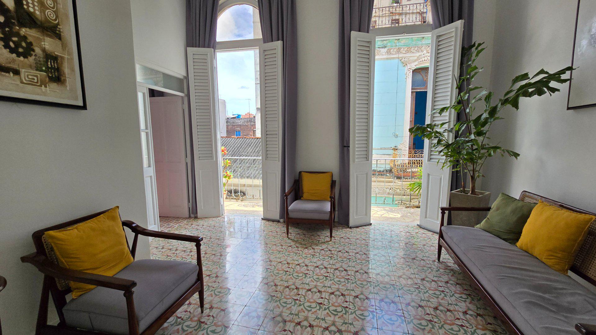 L’Hostal de Armas occupe le deuxième étage d’un immeuble construit en 1917, au cœur de la Vieille Havane, dans l’un de ses quartiers les plus vivants et accessibles. Restaurée entre 2016 et 2018, la maison a conservé l’âme architecturale de l’époque : hauts plafonds, vitraux au-dessus des portes, grandes fenêtres en bois et balcons aux balustrades en fer forgé qui donnent sur la rue. Cette structure d’origine, naturellement ventilée et inondée de lumière, confère au lieu une atmosphère authentique, fidèle au style résidentiel havanais du début du XXᵉ siècle.