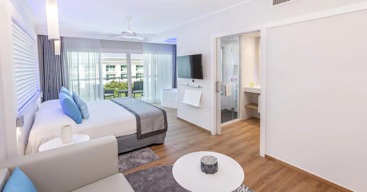 Les Junior Suite sont composées d'une chambre avec baignoire, d'une salle de bain avec douche ainsi qu'un coin salon, un dressing et un balcon, avec vue sur les jardins de l'hôtel, les piscines ou la mer turquoise de Cayo Santa María.