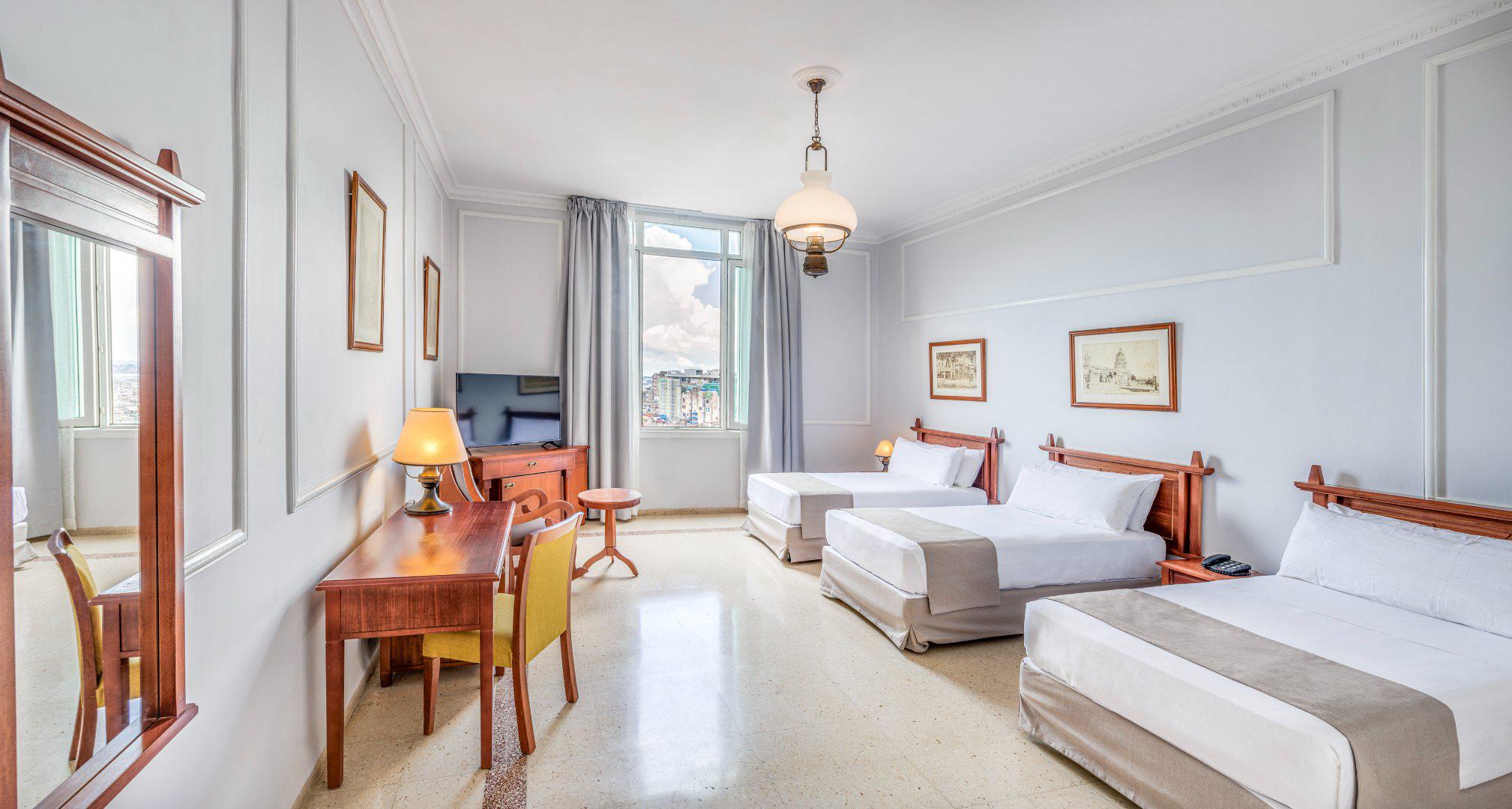 Il dispose de 178 chambres réparties sur neuf étages, décorées dans un style colonial traditionnel alliant confort et élégance. L'hôtel propose des suites standard, supérieures et junior, toutes équipées de commodités modernes. Les chambres standard de l'hôtel Sevilla Habana conservent le charme classique qui caractérise le bâtiment, alliant éléments coloniaux et confort des hôtels modernes. Confortables et lumineuses, elles sont décorées de tons chauds, d'un mobilier fonctionnel et de détails évoquant l'élégance traditionnelle de l'hôtel. Situées entre le premier et le cinquième étage, elles offrent une vue sur la ville, vous permettant de profiter pleinement de l'atmosphère havanaise depuis votre hébergement.