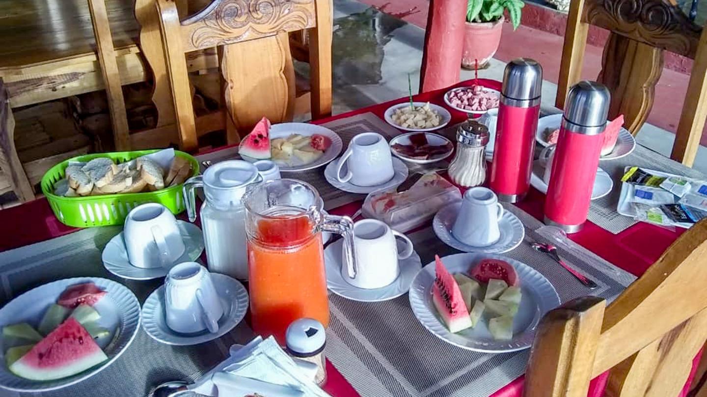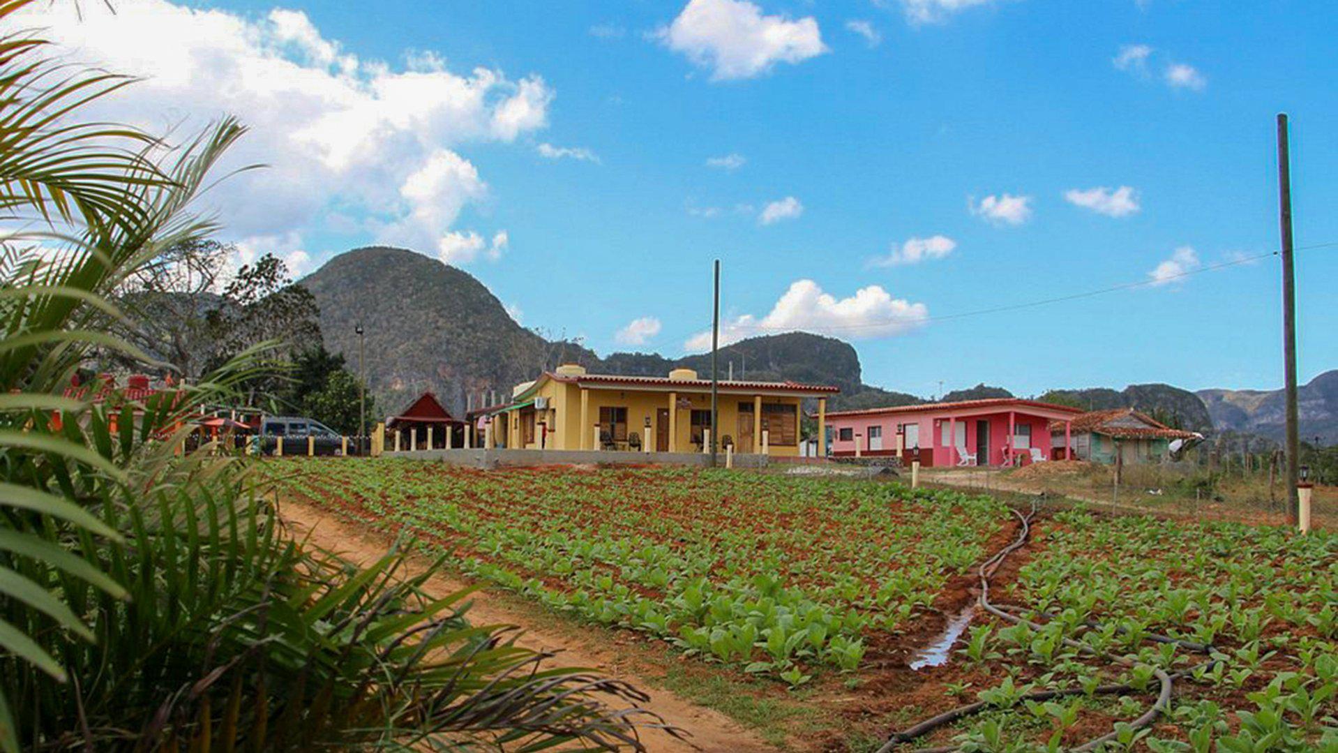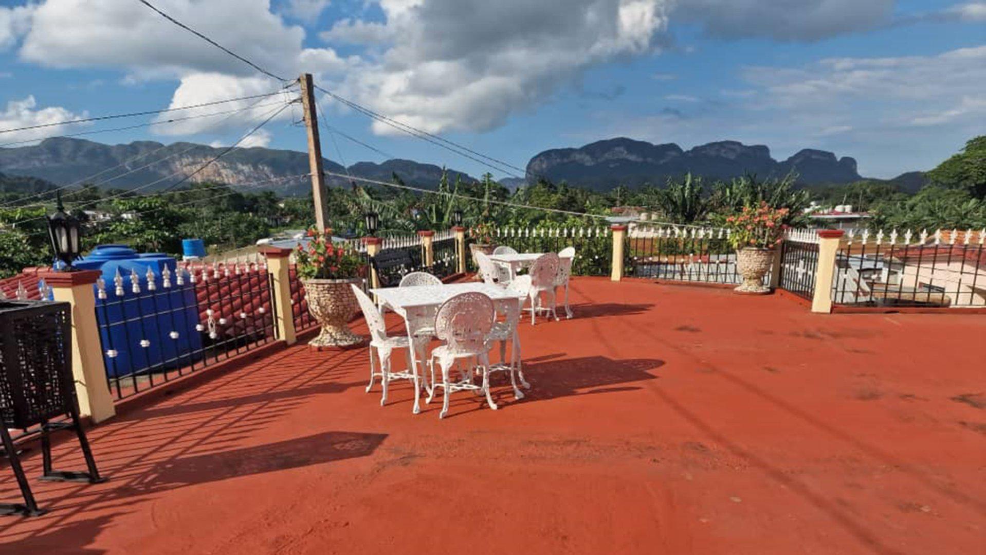 La terrasse sur le toit constitue l’un des points d’observation de la maison. Depuis cet espace, la vue s’ouvre sur la vallée de Viñales et sur ses mogotes, ces formations rocheuses caractéristiques du paysage de la région. Des fauteuils sont installés pour profiter de la brise et du panorama, notamment en fin de journée. Dans le jardin, un petit ranch sert d’espace pour le petit-déjeuner et le dîner.